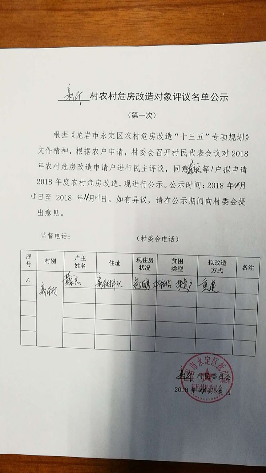 抚市镇新民村危房改造名单公示
