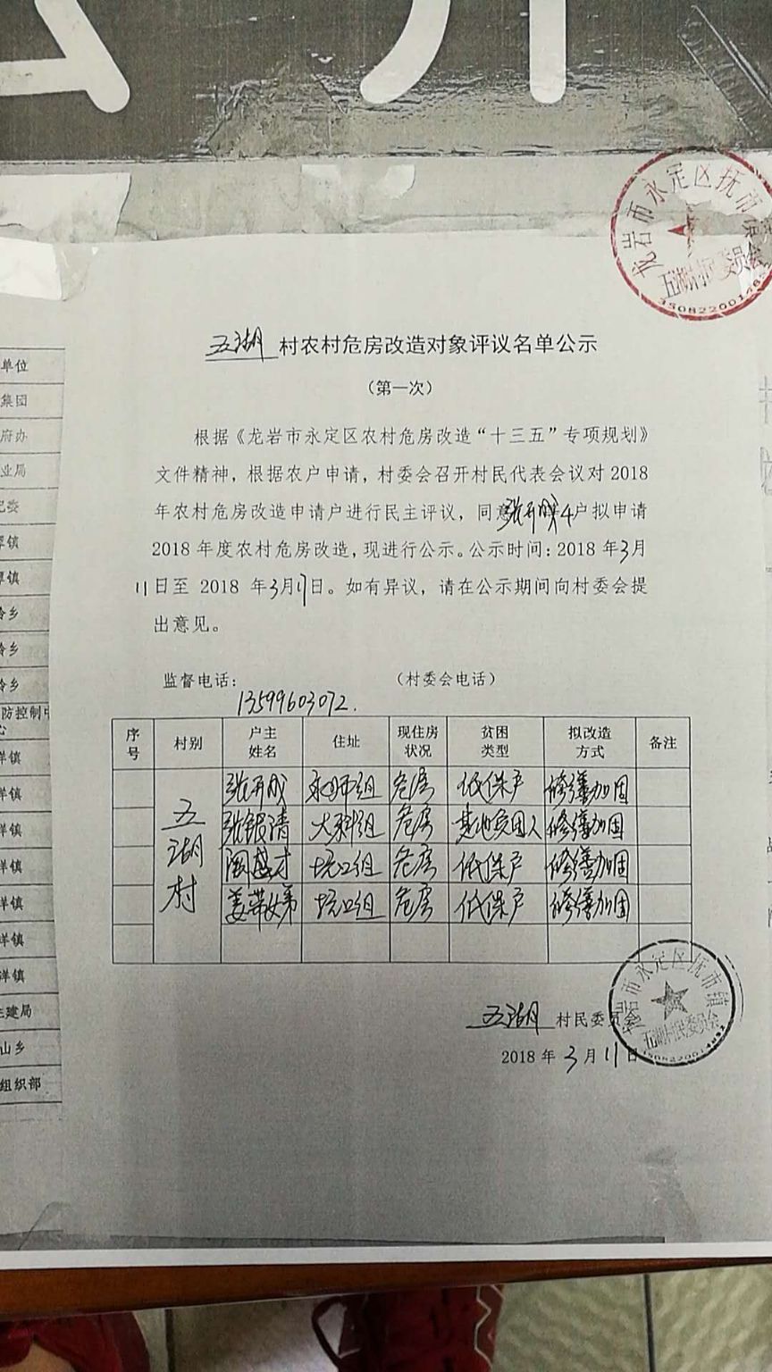 抚市镇五湖村危房改造名单公示