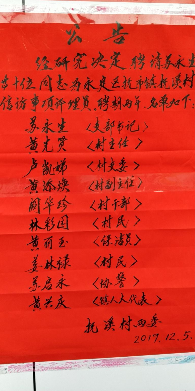 抚溪村信访评理员聘用公示