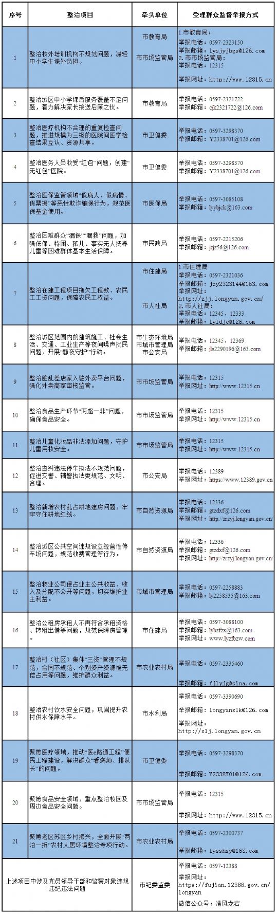 近期,通过广泛征集、基层收集建议、信访举报反映、巡视巡察发现等渠道,在梳理汇总、筛选分类、征求部门意见基础上,省纪委确定了18项内容为规定整治选题,市纪委确定了3项内容为自选整治选题。为方便群众参与监督和反映问题,现将“18+3”共计21个项目受理群众监督举报方式公布如下: