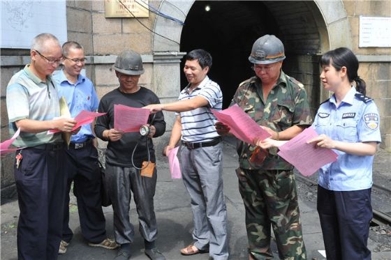 福建省龙岩市永定区纪委监委联合公、检、法、司等政法部门干警,前往工厂、煤矿等开展“扫黑除恶”宣传专项行动,摸排党员干部充当厂霸、矿霸等黑恶势力“保护伞”问题线索,确保宣传无盲区、排查全覆盖。图为区纪委干部与政法干警在永定小坑井煤矿向煤矿工人介绍信访举报渠道。(龙岩市永定区纪委监委)