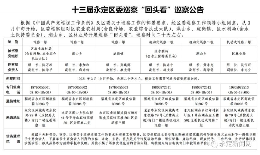 区委巡察二组巡察洪山乡,巡察组组长李加和,副组长邱永锋,巡察时间:3月19日开始,为期二十天左右;专门值班电话:18760055502,通信地址:福建省永定区邮政信箱B0204号(邮编364100),来访地址:永定区洪山乡洪山街41号王寿山宾馆五楼区委巡察二组。