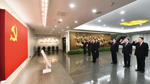 2017年10月31日,中共中央总书记、国家主席、中央军委主席习近平带领中共中央政治局常委李克强、栗战书、汪洋、王沪宁、赵乐际、韩正,瞻仰上海中共一大会址和浙江嘉兴南湖红船。这是31日上午,在上海中共一大会址纪念馆,习近平带领其他中共中央政治局常委同志一起重温入党誓词。 新华社记者 李涛/摄