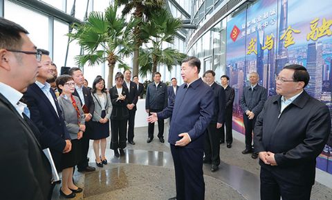 2018年11月6日至7日,中共中央总书记、国家主席、中央军委主席习近平在上海考察。这是6日上午,习近平在上海中心大厦22层的陆家嘴金融城党建服务中心,同正在联合开展主题党日活动的企业党员亲切交谈。 新华社记者 谢环驰/摄