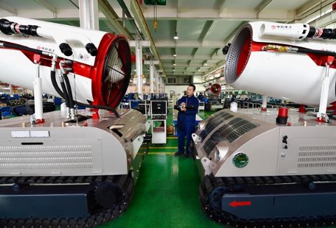 现代科技为国家治理引入新范式、创造新工具、构建新模式,有效提升了国家治理现代化水平。图为河北省唐山市一家消防机器人企业的技术员在调试刚刚下线的消防机器人。(新华社记者 杨世尧 摄)