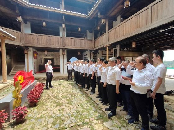福建省龙岩市永定区纪委监委多形式多样化开展党史学习教育,充分挖掘本地红色资源建设牛牯扑“忠诚馆”,引导党员干部追寻红色足迹,传承红色基因,在思源笃行中感悟初心使命,汲取榜样力量。图为该区洪山乡的党员干部在“忠诚馆”面向党旗重温入党誓词。(永定区纪委监委)
