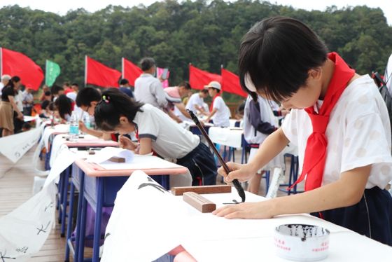 六一前夕,福建省龙岩市永定区纪委监委联合区委宣传部、区教育局等单位举办“土楼清风·童心向党书忠诚”现场书法大赛,通过书写建党百年联句、客家家训楹联,为庆祝中国共产党成立100周年献礼。图为百名学生在牛牯扑“忠诚馆”前的初心广场书写对联。(永定区纪委监委)