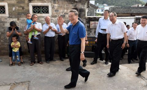 9月24日至26日,中共中央政治局常委、中央纪委书记王岐山在福建调研。这是9月24日,王岐山在连城县红四军革命旧址参观时,向附近的村民挥手致意。(新华社记者张铎 摄)